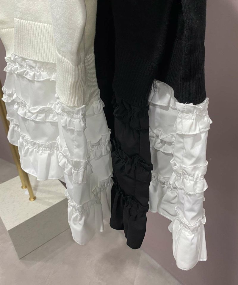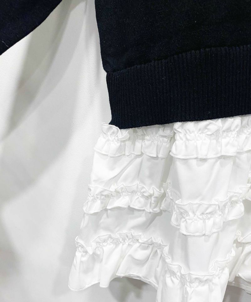 切り替えから下には、程よくハリのあるコットンブレンドの布帛を使い、たっぷりとフリルをあしらいました。