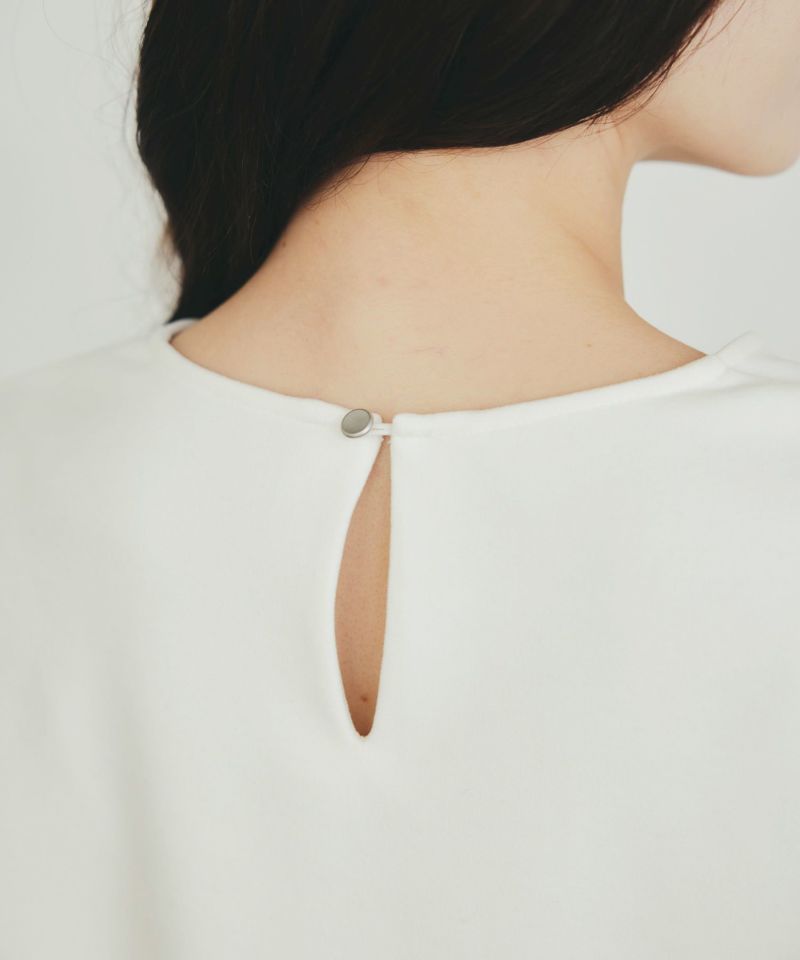首もとはすっきり見えるノーカラー、着脱しやすい後ろボタン付き。