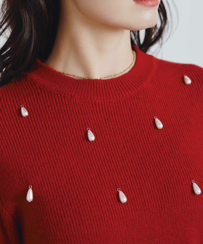 首もとはシンプルなクルーネック、フロントにはティアドロップ型のパールがひとつひとつ散りばめられ、