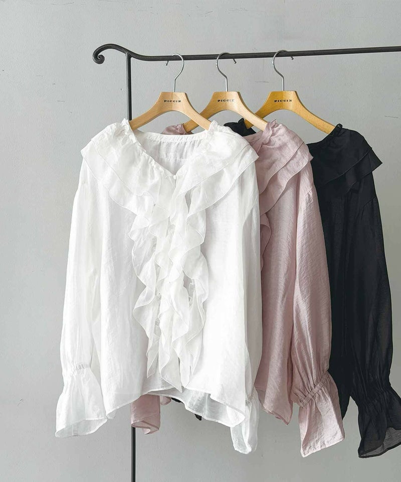 襟から前立てにかけてボリューミーなフリルがロマンティックなデザイン。