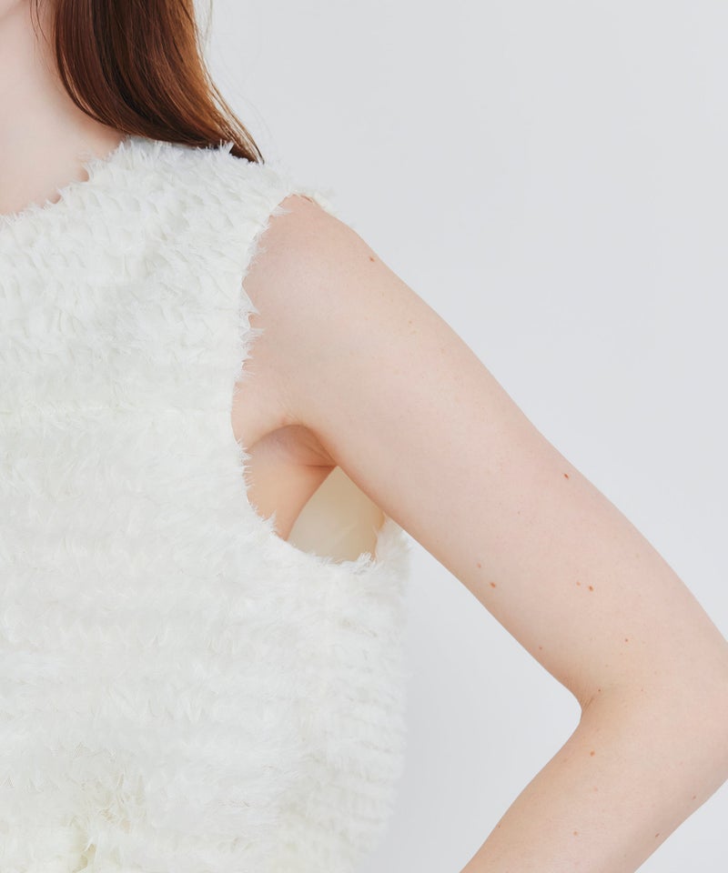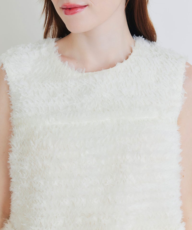ノースリーブとノーカラーで、甘さの中に程よい抜け感をプラス。