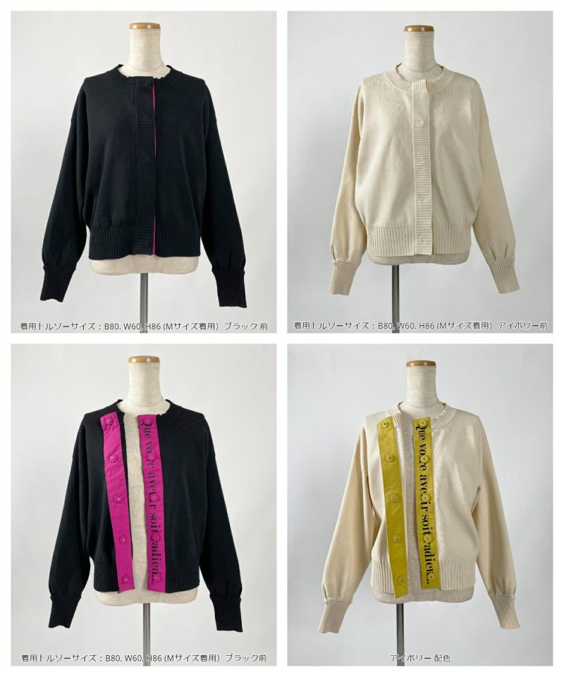 前立て部分にテキスト入り配色テープを配したカーディガン。