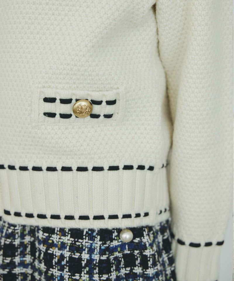 ゴールドのエンブレムボタンがきらりと光り、装いに品のある華やかさをプラス。