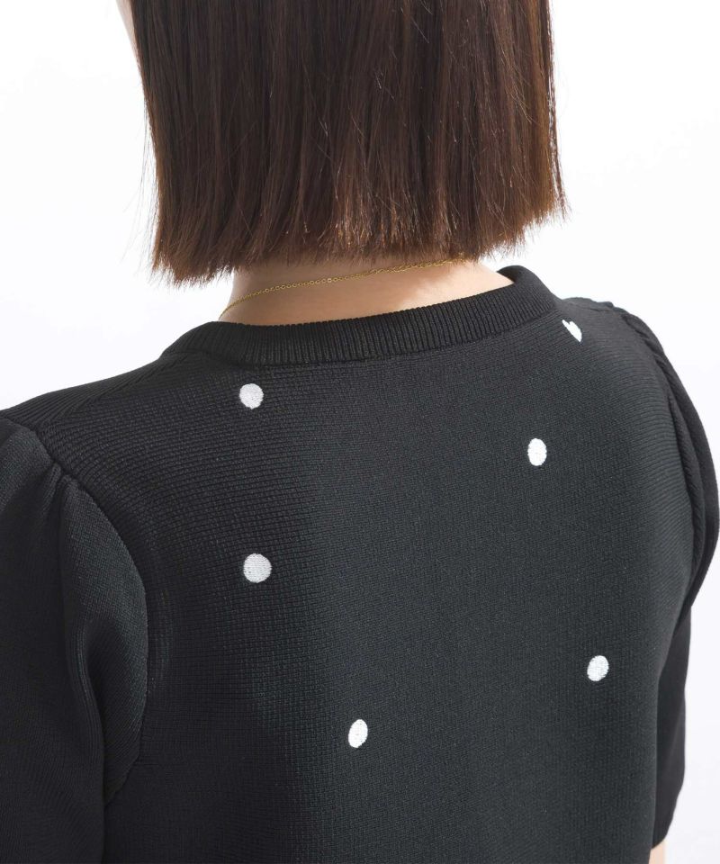 配色ドット刺繍や肩ギャザーを配し、女性らしく華やかな印象に。