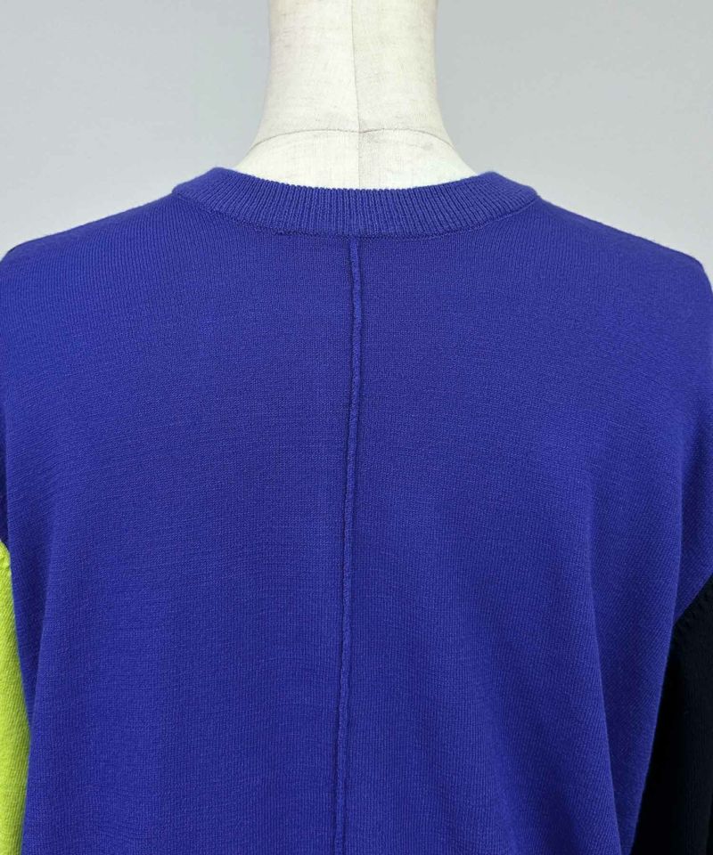 前後の身頃や袖ごとに柄や配色が異なるから、角度によってまったく違う印象に。