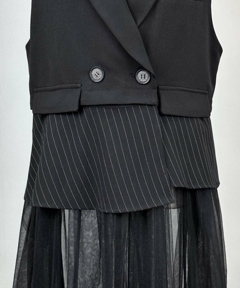 素材 | 本体/表地: ポリエステル96%,ポリウレタン4% 裏地: ポリエステル97%,ポリウレタン3% ストライプ部分: ポリエステル90%,レーヨン7%,ポリウレタン3% 切り替え部分: ポリエステル97%,ポリウレタン3% チュール部分: ナイロン100% |