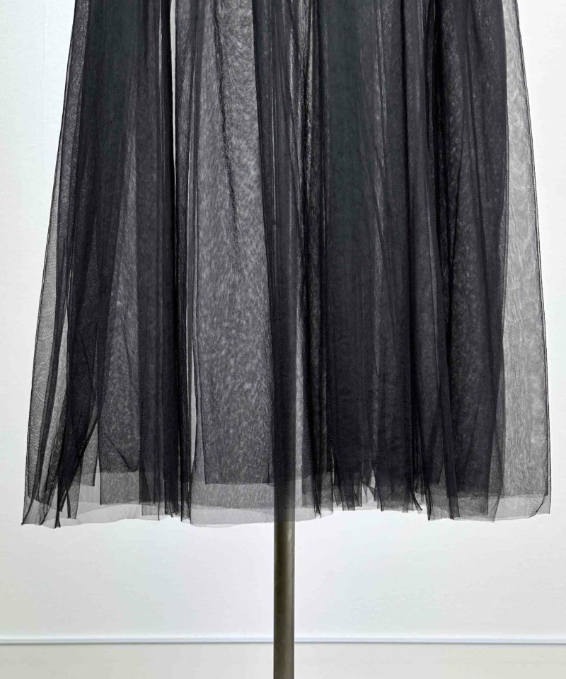 ウエストからふわっと広がるチュールが、歩くたびにやわらかく揺れて、視線を集めます。