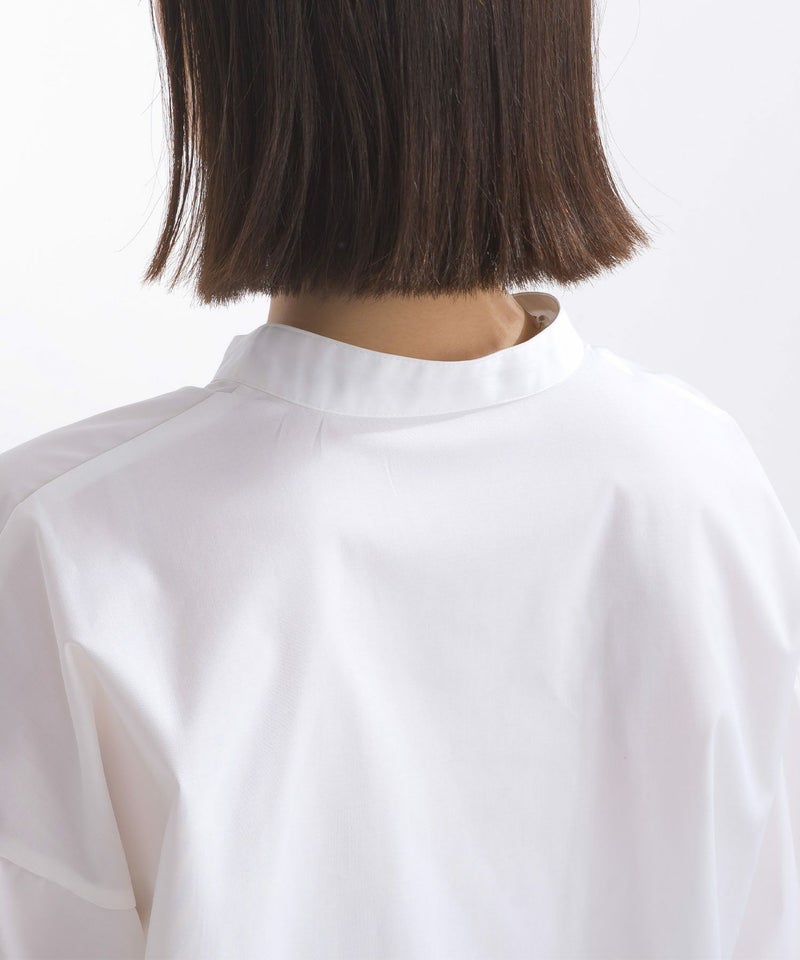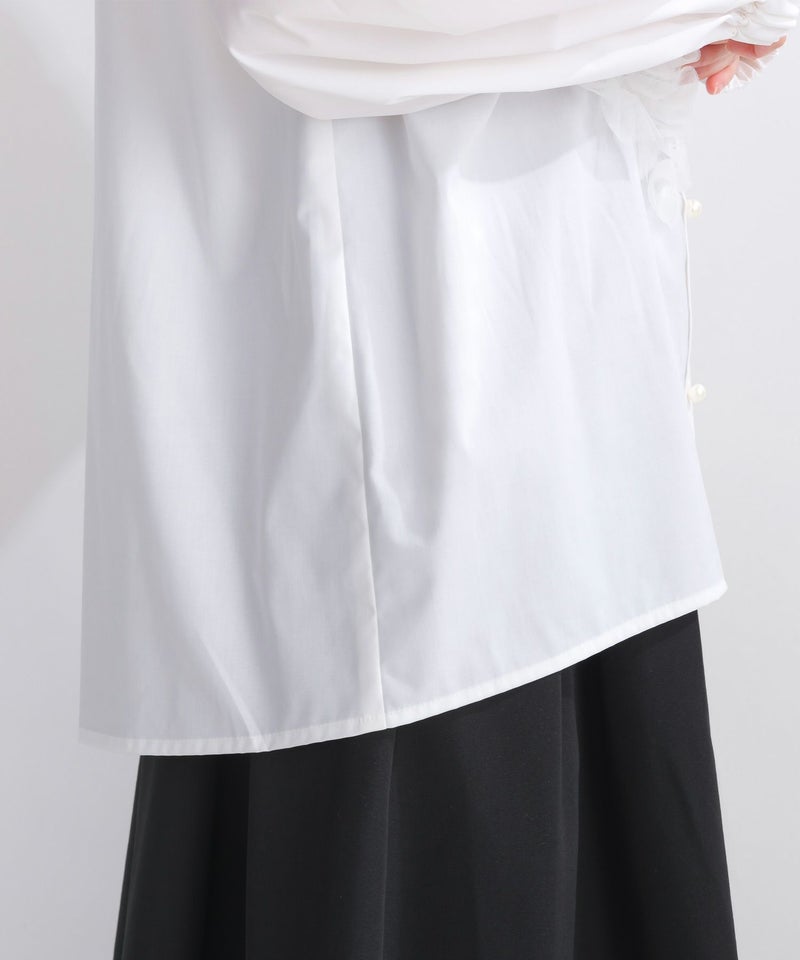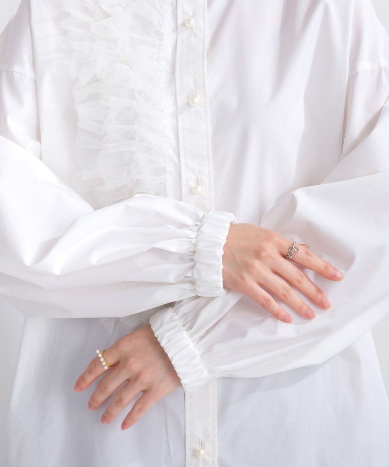 シンプルなノーカラーブラウスに、華やかなチュールフリルとパールボタンを施し