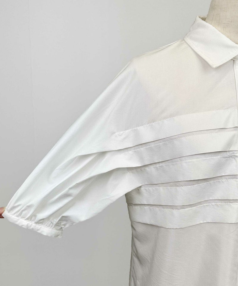 身頃から袖のタックへとつながるプリーツが新鮮で、特徴的な陰影と動きを生み出します。