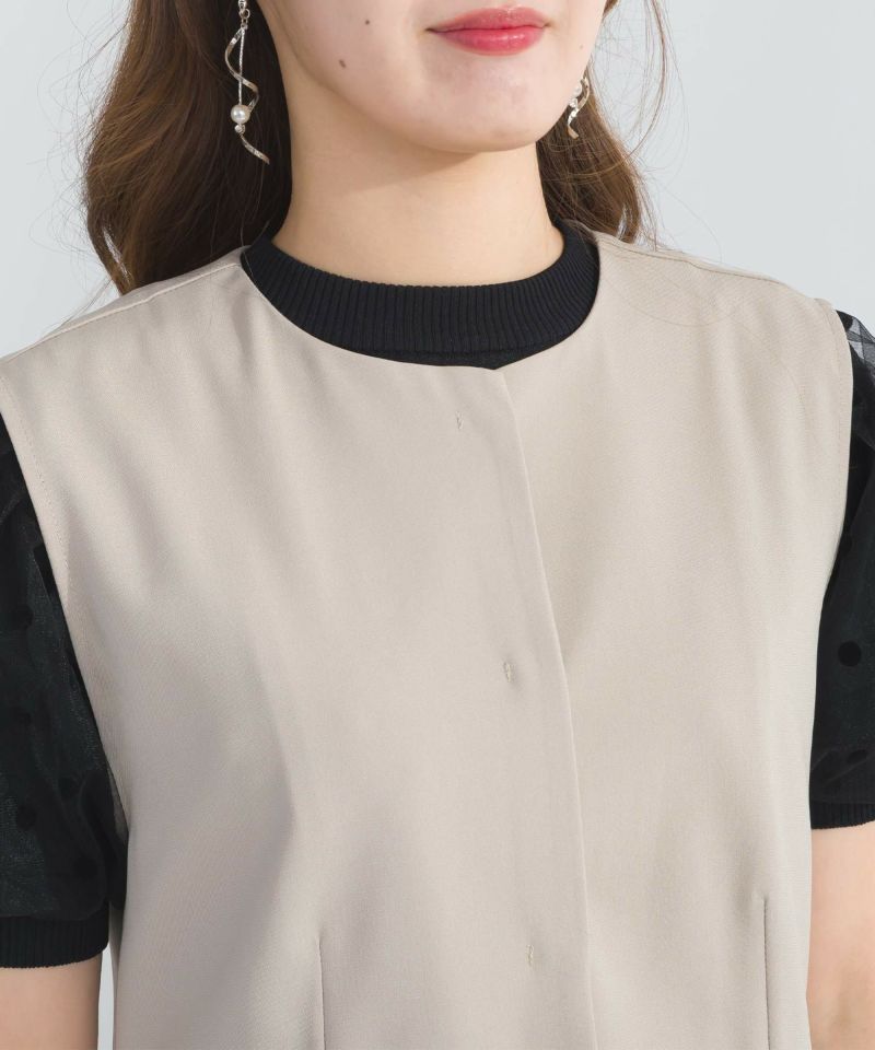 ノーカラーのクルーネックデザインやフロントボタンが見えない仕様で、すっきりとした印象に。
