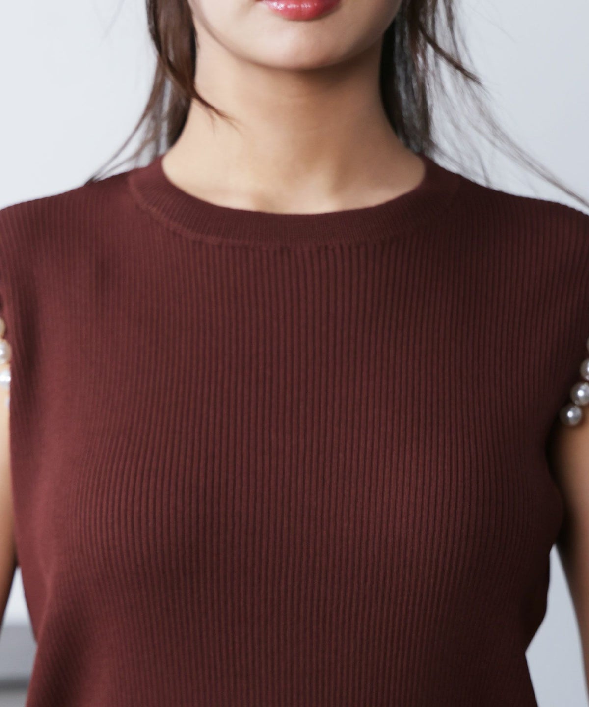 袖口パールノースリーブニット