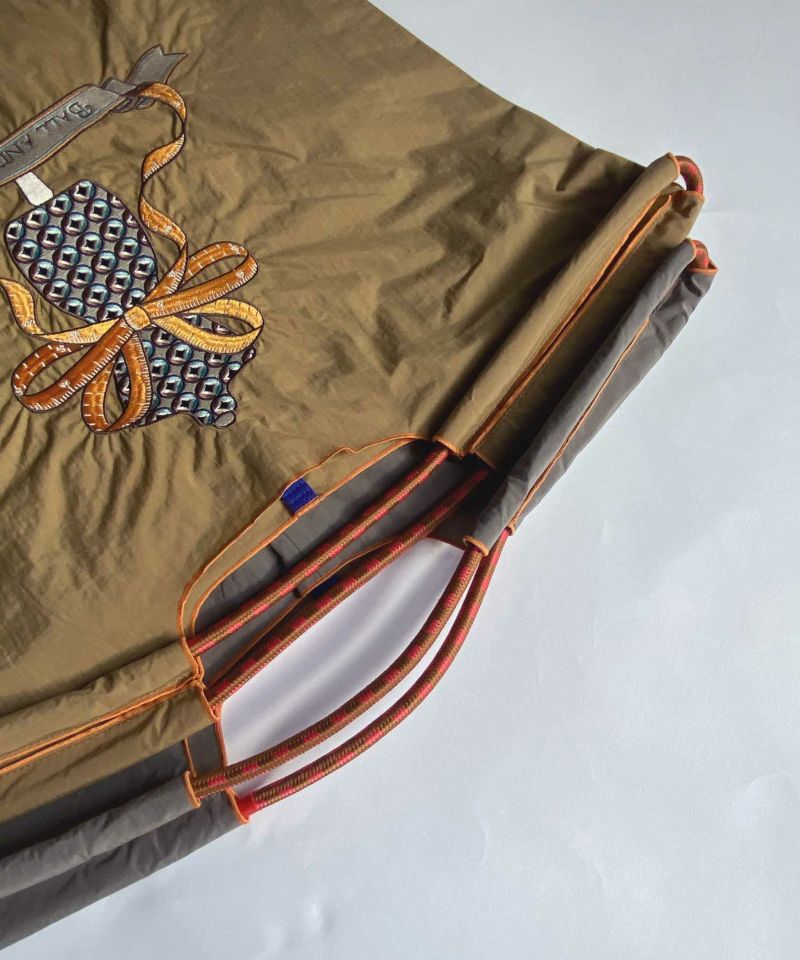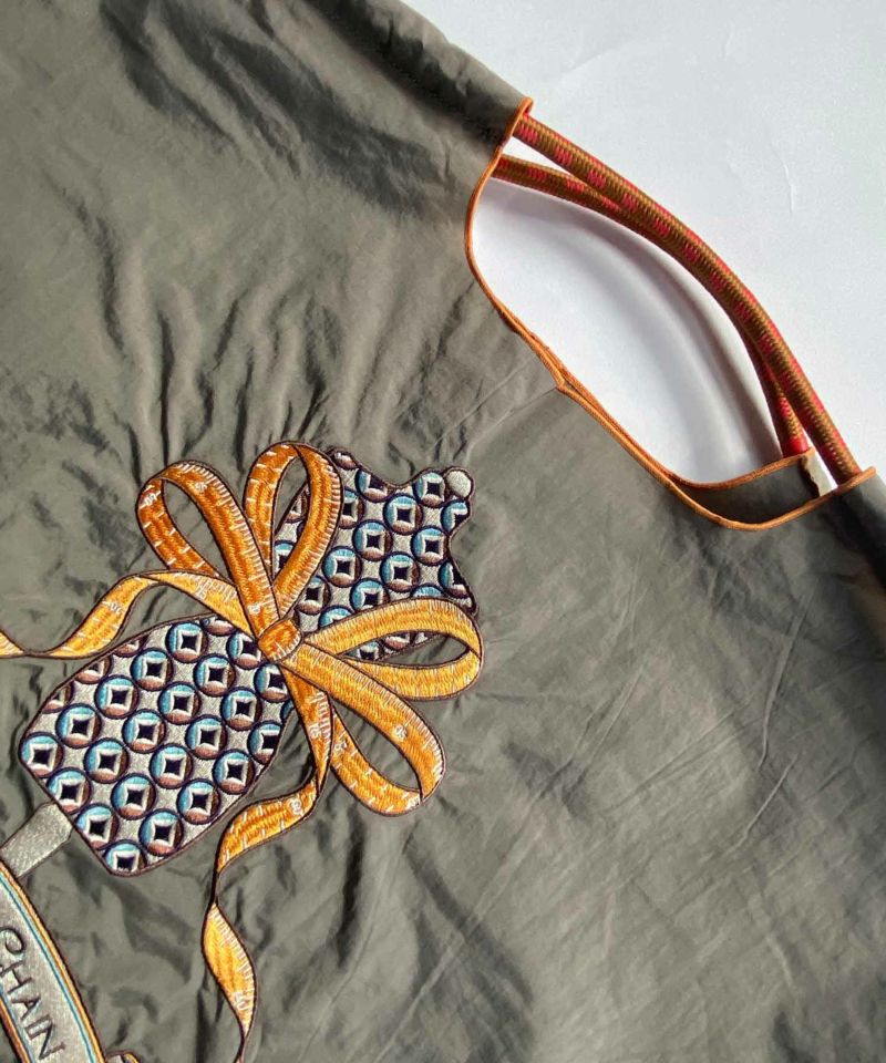 そんな希望を叶えるために、耐久性、撥水性に優れた厚手のポリエステル素材に、グラフィックデザインをそのまま「刺繍」で施すことで、高級感がありデザイン性の高いショッピングバッグを作りました。