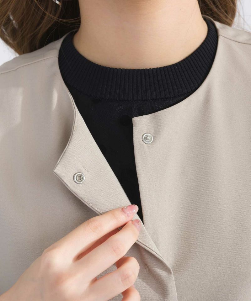 ノーカラーのクルーネックデザインやフロントボタンが見えない仕様で、すっきりとした印象に。
